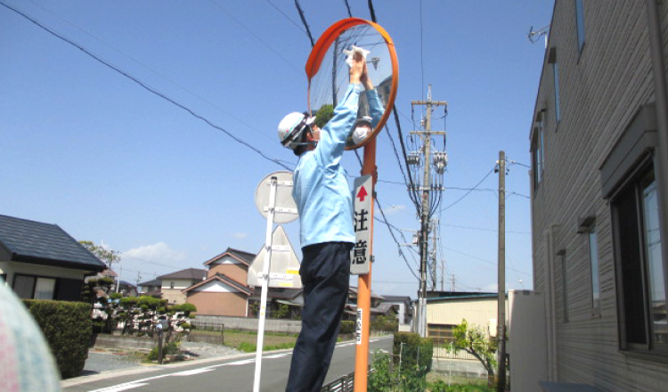 定期的に会社周辺のごみ拾いやカーブミラー清掃を行っています。また朝通学中の小中高学生に交通安全を呼びかける挨拶運動も実施しています。