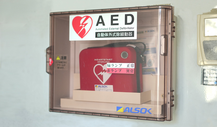 有事の際に、従業員だけではなく、地域の方々も利用していただけるように、AEDと災害用自動販売機を設置しています。
