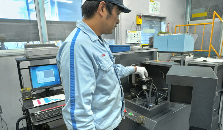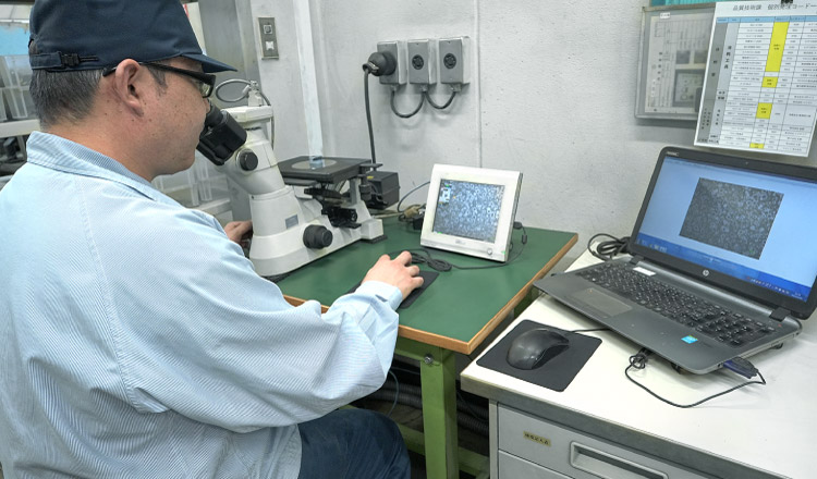 金属顕微鏡を使い、溶湯が健全な組織であるか確認します。組織写真を専用ソフトに取り込むことで、黒鉛の球状化率やフェライト率の測定をします。