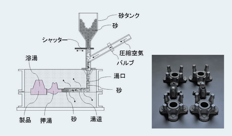 従来の重力鋳造は、製品部をつくるために、押湯・湯道・湯口とすべてのキャビティ―に溶湯を充填させるのに対し、HYPER CASTは、少なく注湯された溶湯を、圧縮空気で製品と押湯に溶湯を充填させ、さらに砂を吹き込むことで溶湯を閉じ込め、湯口・湯道の溶湯削減を実現する革新的なエコ鋳造法です。