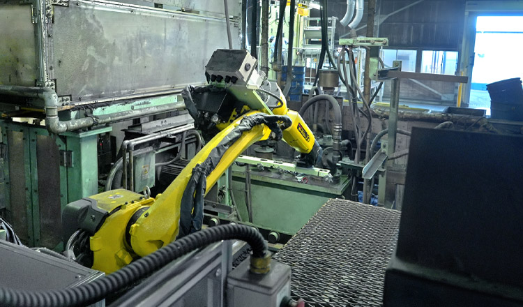 鋳型安定剤をロボットで自動噴霧し、安定した、均一な塗布量を可能としました。ヤマハ発動機の支援と県内企業とわが社による共同開発により実現。