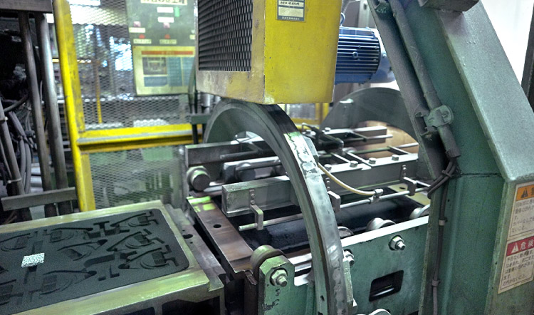 製品につながっている歪みガイドをエアハンマーで打ち抜きます。人の力で行わないため、作業負荷軽減に貢献しています。浜松の企業とヤマハ発動機とわが社による共同開発により実現。